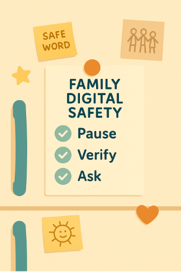 - Set Simple Family Safety Rules A short list of reminders like “pause, verify, ask” before acting on messages.